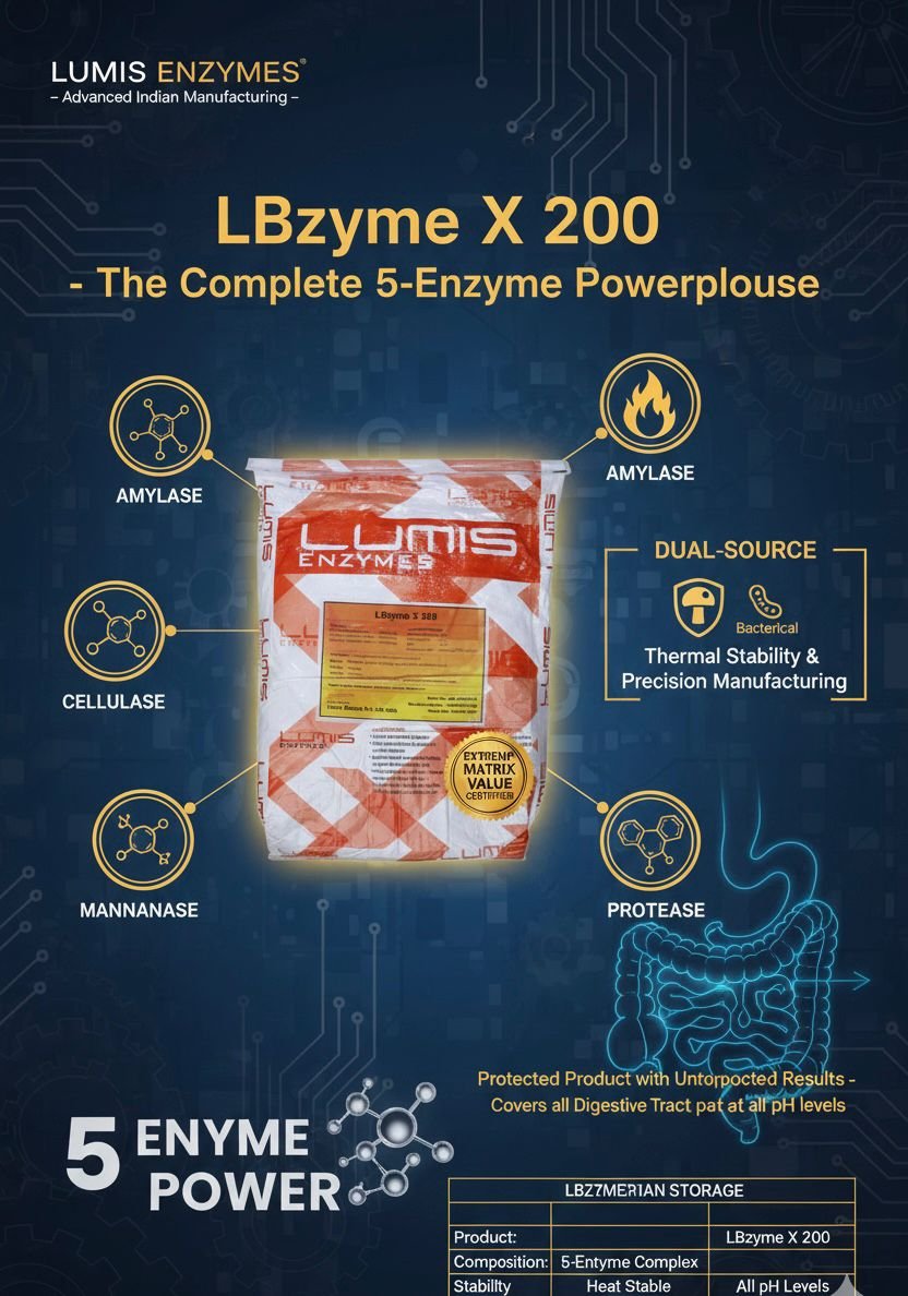 Amylase 30000 u/g , Xylanase 5000 u/ g , Cellulase 25000/ g, protease 3500 HUT/ g and Mannanase 500 u / g